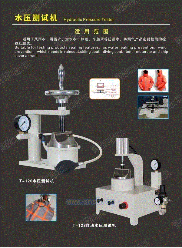用途:本机用于检测防水服系列、雨衣系列、帐篷系列、防水袋系列、防水手套系列等产品在加入一定压力的水压,通过压力表可知被测物所受到的压力大小以及被测物在这一压力作用下是否合格。 设计新颖,操作简单,工作稳定,高度集成,功耗低,能准确快速的测试出面料、服装接缝处和十字位的耐水压。适用于帐篷、雨衣、羽绒服、滑雪衣、登山服、潜水衣、航海服、PVC/PU/PE/PA涂层面料、雪地靴、广告气球、手套、消防服装、**、**服、特种制服等各种面料及服装十字位和直道位的耐水压测试。 0-10,000毫米水柱 测试时间延迟0-10分钟.
